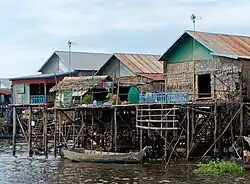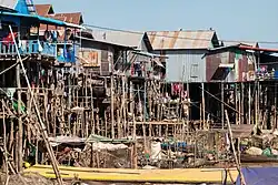 Many houses and buildings are constructed on stilts ranging from 6 m to 9 m to accommodate the changes in water level between wet and dry seasons.[1]