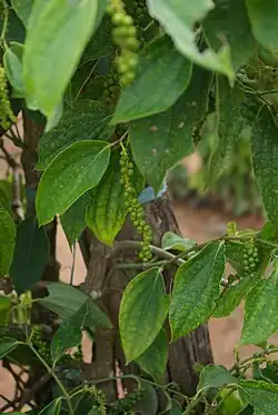 Kampot pepper is a certified geographical indication (GI) product in Cambodia (since 2010) and in European Union (since 2016).[2] There are two varieties: the small leaf (កំចាយ, kamchay) and the big leaf variety (lampong or belantoeung).[3]