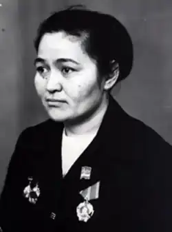 Kamshat Baigazinovna Donenbaeva (Kazakh: Кәмшат Байғазықызы Дөненбаева; Kämşat Baiğazyqyzy Dönenbaeva, [kʰæmʂæt tʰønʲenbαjiva]; 15 September 1943 – 9 November 2017) was a Kazakhstani agricultural laborer, who served as a deputy in the Supreme Soviet from 1974 to 1989. For exceeding production goals, she was awarded the Order of Lenin twice and in 1975 received the Hero of Socialist Labour medal.