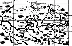 The Kamyshlov Log is part of the Ishim Plain, West Siberian Plain. It is the 500 km (310 mi) long ancient valley of the Kamyshlov river, which has left a chain of disconnected residual lakes having fresh and briny waters. The course of the now vanished river stretched across the Bozaral Basin, between the Ishim and Irtysh rivers. The upper stretch begins in Kazakhstan, at the Kamysakty river, which flows from the Kokchetav Upland into the Bolshoy Tarangul lake at 54°02′N 68°22′E / 54.033°N 68.367°E. The trench runs first roughly northeastwards and then eastwards. It has a width between 1 kilometer (0.62 mi) and 20 kilometers (12 mi), with a depth ranging from 10 meters (33 ft) to 20 meters (66 ft).[1][2][4] The lakes are mostly shallow and some dry up in the summer. Some of the main ones are Kamysty, Taldyaral, Ulken Zharma (Үлкен Жарма), Reinfeld, Pokrovskoye, Sandy, Churino, Severnoye, Sergeevskoye, Zheltoye, Ovtsevodskoye, Krugloye and Topkoye.[5][6]