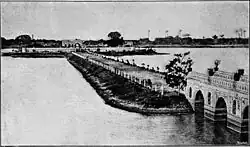 British artist James Forbes visited Ahmadabad in 1781 after the fall of Mughal Empire when Ahmedabad was under Maratha rule. He found the gardens at lake neglected, the summer-palace in ruins and the bridge with 48 stone arches connecting Nagina Baug island to the bank in dilapidated condition. He specially noted a species of palmyra in the Nagina Baug which is very uncommon. The tree grows in a straight stem very high and then spreading several branches with a tuft of spreading leaves at the end of each branch. It is still there. After a century, when Ahmedabad was under the British rule, the Kankaria lake was restored by the Collector of the district, Borradalle in 1872. A road was built from the Raipur gate to the lake. The high banks of the lake were organised and the trees were planted on them. Of the original arched bridge, a small portion was restored and the rest of length is made with earthen bank. In the island, the steps were restored on all four sides, the ancient well was cleared out, the fountain and the pleasure house were restored. the new pierced parapet wall built. In 1879, it was proposed to connect the lake with Khari river by 11 miles long canal and supply water to Chandola lake but it never materialised.[2]