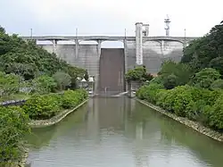 The Kanna Dam (漢那ダム) is a concrete gravity dam on the Kanna River in Ginoza, Okinawa Prefecture, Japan. The purpose of the dam is water supply and flood control. After studies were carried out in the 1970s(starting in 1973 and ending in 1978), construction on the dam began in 1982 and it was completed in 1992.[1] The dam is 45 m (148 ft) tall and 185 m (607 ft) long. In order to retain the reservoir, a 37 m (121 ft) tall and 500 m (1,640 ft) long saddle dam was constructed directly northeast of the dam.[2] A fish ladder was installed on the dam during construction to assist the migration of fish, shrimp and crabs. Mangroves downstream of the dam were restored after construction and the area is a tourist destination along with a habitat for water fowl.[3]