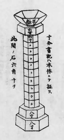 In Tenrikyo, the kanrodai (甘露台) is a hexagonal pillar in the Divine Residence (Oyasato) of the Tenrikyo Church Headquarters in Tenri, Nara, Japan. It marks the Jiba. Adherents believe that when the hearts of human beings have been adequately purified through the Service, a sweet dew would fall from the heavens onto a vessel placed on top of the stand. Since 1875, there have been several different kanrodais installed at the Jiba.[1]