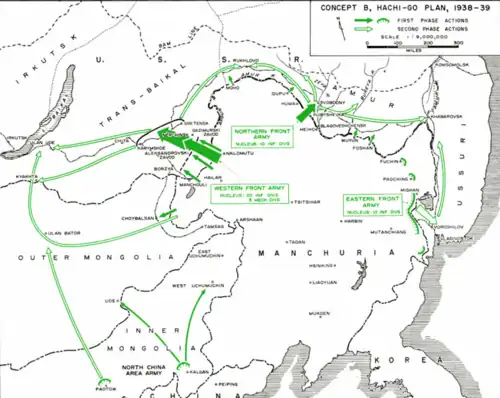 Independently of their yearly planning, the Operations Bureau of the Japanese Army General Staff and the Kwantung Army co-operated in 1938 and 1939 on a pair of related contingencies under the umbrella term "Operational Plan No. 8," or the "Hachi-Go"[20] plan. Both variants, designated Concepts "A" and "B," examined the possibility of an all-out war with the Soviet Union beginning in 1943.[21] Both were far larger than anything previously conceived of by the Japanese: against an expected 60 Soviet divisions, the IJA would commit up to 50 of its own, to be delivered incrementally from China and the Home Islands. Concept A closely mimicked the 1937 war plan by calling for attacks across the eastern and northern borders of Manchuria while maintaining a defensive stance in the west, but the more ambitious Concept B examined the possibility of striking out into the vast steppe between the Great Khingan Mountains and Lake Baikal in the hopes of quickly cutting the Trans-Siberian Railway. Such a move, the Japanese believed, would immediately isolate the whole region from European Russia and doom the remaining defenders to defeat in detail.[22] The scope of operations was enormous: the two sides would be engaged over a front nearly 5,000 kilometers (3,100 miles) in length, with Japan's final objectives being up to 1,200 km (750 mi) deep into Soviet territory. In terms of distances, Concept B would have dwarfed even Operation Barbarossa, the German invasion of the Soviet Union in June 1941.[c]