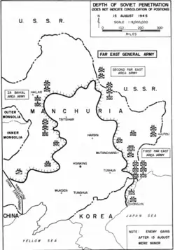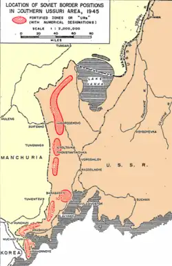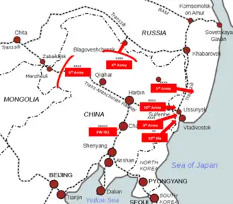 Like the previous concepts drawn up in the aftermath of the Nomonhan Incident, Kantokuen would begin with a massive initial blow on the Ussuri Front against Primorye that would be followed up with another attack to the North against Blagoveshchensk and Kuibyshevka.[45] Under the umbrella organization of the First Area Army, the Japanese Third and Twentieth Armies, supported by the 19th Division of the Korea Army, would penetrate the border south of Lake Khanka to overcome the main Soviet defensive lines and threaten Vladivostok. Simultaneously, the Fifth Army would strike just south of Iman (now Dalnerechensk) to complete the isolation of the Maritime Province, sever the Trans-Siberian Railway, and block any reinforcements arriving from the north. In northern Manchuria, the Fourth Army would at first hold the Amur River line before it transitioned to the offensive against Blagoveshchensk.[46][47] Meanwhile, two reinforced divisions of Japanese troops outside the Kantokuen force structure would start operations against Northern Sakhalin from both the landward and the seaward sides with the aim of wiping out the defenders there in a pincer movement.[48] Other second-stage objectives included the capture of Khabarovsk, Komsomolsk, Skovorodino, Sovetskaya Gavan, and Nikolayevsk. Additionally, amphibious operations against Petropavlovsk-Kamchatsky and other parts of the Kamchatka Peninsula were contemplated.[49][50]
