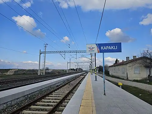 Kapaklı station is a station in Kapaklıi, Turkey. TCDD Taşımacılık operates a daily train, the Aegean Express, from İzmir to Eskişehir.[3] Prior to a schedule change in December 2017, the Karesi Express, 6th of September Express and the 7th of September Express stopped at the station.