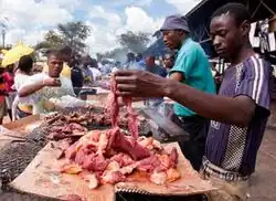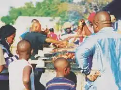 Kapana is a way of preparing raw meat, typically beef, in Namibia by grilling it on an open fire.[1] The grilled meat is often sold at stalls in open markets; it is cut into small pieces and grilled and sold while it is cooking.[2] People from all walks of life come and enjoy the meat. There are often many people selling it at one place, so the price is always negotiable. Kapana business has contributed in a small way to the economic development of the country[3] by giving unemployed young people an opportunity to start their business with a very low capital and look after their family.[4] The township of Katutura in Windhoek is known for its kapana.[5]