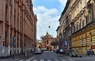 ![]() View to the west from the intersection with Straszewskiego Street. On the left Nowy Świat, on the right and straight ahead Piasek. The street perspective is closed by the Capuchin Church. | |