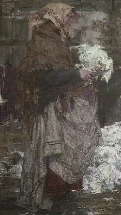 Art and local historian Peter Dulsky wrote that Nicolai Fechin had the idea of painting Kapustnitsa in 1907.[2][21] The creation of the painting was preceded by a long period of work by the artist, collecting materials from the field, determining the color and composition. It is believed that the artist collected materials in Pushkarka near Arzamas in preparation for the future final work.[22][23][6] Dmitry Seryakov, a student of art history, claimed that the artist came to Pushkarka to make sketches and that it was here that he had the idea for the canvas.[21] Nicolai Fechin made numerous pencil sketches, studies and sketches of compositions in the technique of oil painting.[2][6] To date, only two drawings are known to experts — Peasant Woman (Young Woman with a Tray) (1909, paper, charcoal, 22 × 16 inches) and Peasant Woman in a Jacket (1909, paper, charcoal, 23 × 14 inches). Both were for a long time in the private collection of Iya Feshina-Brenham, the artist's daughter, in Taos, New Mexico in the United States.[24] There is also a known pastel sketch (1909, paper, pastel, 64 × 43 cm, Samara Regional Art Museum, Zh-902, the sketch came in 1956 from the Ministry of Culture of the RSFSR)[25] and three or four gouache sketches (State Museum of Fine Arts of the Republic of Tatarstan):[6] Kapustnitsa (1909, paper, ink, gouache, sheet size — 23.5 × 33.2 cm, drawing size — 14.2 × 23.9 cm, inv. g-1844), Kapustnitaa (1909, paper, cardboard, ink, gouache, 22.9 × 34 cm, 15.5 × 27 cm, inv. g-1834), Kapustnitsa (1909, paper, cardboard, ink, gouache, 22.9×34 cm, 15.5 × 27 cm, inv. g-1834), Kapustnitsa (1909, paper, gouache, sheet size — 23.5 × 33.4 cm, the size of the figure — 15 × 27 cm, g-1848).[26][Note 1][27]