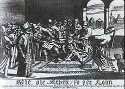 Kara Mustafa Pasha was of Turkish origin.[1][2][3][4][5][6][7] However, he was brought up in the Köprülü family, of Albanian origin.[8][9][6] He was born in the village of Mirince/Marınca near Merzifon (now called Karamustafapaşa after him), the son of a sipahi, cavalry man.[10] His father is said to have served under Köprülü Mehmed Pasha. Possibly as a way to increase his possibilities to start an administrative career, he was introduced into the Köprülü household, where he was educated by Köprülü Mehmed Pasha, and married into the Köprülü family.[11] How he entered the family and the details of his marriage are unclear. Within the household's inner service (enderun), he held the positions of letter-carrier (telhisci, or assistant to the grand vizier)[12][10] to Köprülü Mehmed Pasha, and of silahdar (armourer). He then entered the household of the Sultan as mirahor-i-sani (master of the horse). It is said that while growing up, differently from his adoptive Köprülü brothers, he disliked alcohol, as well as Europeans and other non-Muslims.[4] A contemporary French account says he had two children with the little Köprülü princess, who both died young, and that his wife died shortly after their death, at 31. He had four concubines (Fatma, Emine, Ayşe, Zeynep), and by them at least two sons, Yusuf and Mehmed. According to another contemporary report by Giovanni Benaglia, secretary of the Austrian ambassador in Istanbul, he divorced his "beloved Köprülü princess" after their engagement and after they had many children, and gave her to a French renegade, one of his favorites. An account by a contemporary who visited his household, Claudio Angelo di Martelli, reports of three sons who survived his death: Yusuf, Mehmed, and the youngest Ali.[10]