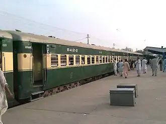 The Karachi Express began in 1943 and was originally between Karachi and Peshawar. Shortly after, the route was shortened between Karachi to Lahore. In 1999, Pakistan Railways began running non-stop, with only one technical stop at Khanpur. By 2003, economy class coaches were added and ceased to be a non-stop train.[4] During the PPP government in Pakistan, 2008–2013, the train service was almost completely finished due to shortage of power vans and locomotives. During much of 2012, the train was only running with economy class coaches and coupled with Millat Express from Khanewal onwards to Karachi. On 16 May 2013, the train was refurbished and a new rake was arranged that included 10 Economy, 3 AC Business, 2 AC Standard and 1 AC Sleeper class coaches. The route of the train was also changed so that now the train is running between Karachi and Lahore via Lodhran-Multan-Khanewal section instead of the Lodhran-Jahanian-Khanewal section. The train still covers the 1,225 kilometres (761 mi) distance between Karachi and Lahore in 18 hours.[5]
