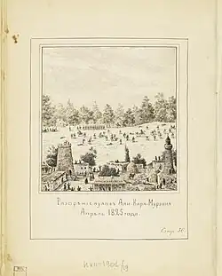 According to a Russian report from 1820, Aliy's village was located north of the Kuma River and consisted of 60 households.[5] In 1822, together with his subjects, he established the village of Karamirzey in the lands of the Besleney Circassians, beyond Mount Akhmet and at the source of the Laba River, in a hard-to-reach mountain pass (near present-day Akhmetovskaya).[4] Within a short time, many warrior nobles and princes, along with their subjects, settled in Karamirzey. As a result, the village's population grew to at least 200–250 households.[4][2] Karamirza Aliy became one of the most prominent and influential leaders of the Hajret Kabardians.[2]