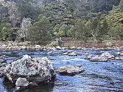 At Karangahake, several walks and tracks ranging from 30 minutes to over 2 hours start at the Karangahake Reserve car park and picnic area.[2] One of the most spectacular walks in the area is the "Windows Walk", a loop walk that leads through the old gold mining tunnels of the Talisman Mine, crosses the Waitawheta River over a suspension bridge, and joins the Crown Tramway Track back along the cliffs of the Waitawheta Gorge.[4][5] The path follows the route of a bush tramway and passes by "windows" in the cliff face at the end of mining tunnels, which were used to tip tailings down into the Waitawheta Gorge. Two of the mining tunnels, which are about 2 metres (7 ft) tall and wide, are safe to enter. They end abruptly after about 50 metres (164 ft) and are home to glowworms and cave weta.