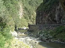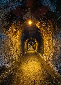 The East Coast Main Trunk Railway used to run through the gorge until it was bypassed by the Kaimai Deviation. The Karangahake Gorge section of the line, including a 1100-metre tunnel,[6] is now a combined walkway and cycleway, part of the Hauraki Rail Trail, and together with the natural sights of the gorge, makes it into a well-visited local tourist attraction.[7] The railhead at the Waikino end of the gorge still exists, preserved as part of the Goldfields Railway to Waihi.[8]