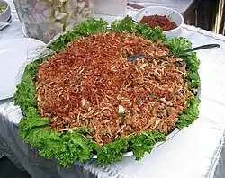 Karedok (Aksara Sunda: ᮊᮛᮦᮓᮧᮊ᮪) is a raw vegetable salad in peanut sauce from Sundanese region, West Java, Indonesia.[1] It is one of the Sundanese signature dish. It traditionally includes longbeans, cucumbers, bean sprouts, cabbage, legumes, lemon basil, chayotes and small green eggplant, covered in peanut sauce dressing, but there are now many variations. It is very similar to gado-gado, except all the vegetables are raw, while most of gado-gado vegetables are boiled, and it uses kencur, lemon basil and eggplant. Karedok is also known as lotek atah (raw lotek or raw gado-gado) for its fresh and raw version of the vegetable covered with peanut sauce. Karedok is widely served as daily food in the Sundanese family, usually eaten with hot rice, tofu, tempeh, and krupuk. Nowadays karedok can be found in many variation from hawkers carts, stalls (warung) as well as in restaurants and hotels both in Indonesia and worldwide.[2]