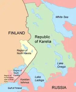 On the other side of Lake Ladoga, the River Svir is usually thought of as the traditional southern border of Karelian territory while Lake Onega and the White Sea mark the Eastern border. The River Kymi marks the historic western border of Karelian territory as it served as the boundary between the Häme Finns and the Karelians during the Middle Ages.[2] The River Kymi is also said to have formed a boundary between the eastern and western cultural spheres by the beginning of the Bronze Age at the latest.[3] In the North lived the nomadic Samis, but there were no natural borders except for large wooded areas (taiga) and the tundra.
