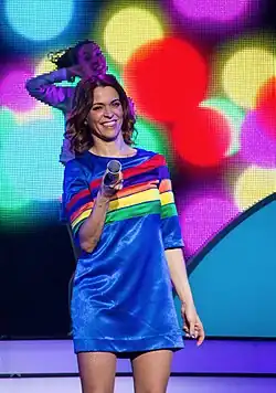 Karen Franciska Maria Louisa Damen (Dutch pronunciation: [ˈkaːrə(n) ˈdaːmə(n)]; born 28 October 1974) is a Belgian singer, actress, host and one of the first members of girl group K3. She acted in a few movies and hosted a few programs.