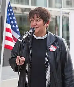 Karen Oliveto (born April 4, 1958[1]) is an American bishop. She is the first openly lesbian bishop to be elected in the United Methodist Church. She was elected bishop on July 15, 2016, at the Western Jurisdictional conference.[2] Her four-year term of service began September 1, 2016 and she currently serves as the bishop of the UMC's Mountain Sky Conference (created in 2018 when the UMC's Rocky Mountain and Yellowstone Conferences merged during Oliveto's tenure as bishop in both conferences);[3][4] she was officially installed on September 24.[5] At the time of her election, she was the senior pastor of Glide Memorial Church in San Francisco.[6] Oliveto is married to Robin Ridenour, who is a deaconess in the United Methodist Church's California-Nevada Conference.[2]