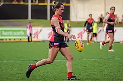 Paxman continued recording high disposal counts the next few weeks, collecting 27 disposals in the 14-point win over the Western Bulldogs at Whitten Oval,[32] 24 in the 6-point win against Carlton at Casey Fields,[33] 25 in the 5-point loss to Greater Western Sydney at the Blacktown International Sportspark[34] and 21 in the 2-point win over Adelaide at TIO Stadium.[35] Heading into the final round, she was leading the disposal count in the league.[36] Paxman's 17 disposals in the 54-point win over Fremantle at Casey Fields in the final round pushed her to second overall in the league, finishing one disposal behind teammate Daisy Pearce.[37] She was named in Melbourne's best players in every match of the year apart from the round six win against Adelaide,[38][39][40][41] and was consequently predicted to poll highly in the league best and fairest according to Herald Sun journalist Lauren Wood and AFL Media reporter Sarah Black.[36][42] Paxman was ultimately runner-up in the award, finishing with ten votes (four votes behind winner Erin Phillips).[43] Her season was further rewarded with being one of three Melbourne nominees for the AFL Players Association most valuable player award[44]—in which she was also the runner up behind Phillips[45]—and she was listed in the 2017 All-Australian team.[46] With the inaugural season only having one-year contracts, Paxman re-signed with Melbourne for the 2018 season during the trade period in May 2017.[47]