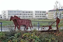 There is a large open space along the northern side of the street between King-Albert-Bridge and Giesserstrasse which is called Jahrtausendfeld (Litt.: millennium field). It was only created in 1999 when the former VEB Bodenbearbeitungsgerätewerk Leipzig (Litt.: soil processing equipment factory), formerly Rudolph Sack agricultural machinery factory, was demolished. On the occasion of Expo 2000 there was an art intervention with disseminating rye which is recalled by the installation ″Man and horses on millennium field″.[22]