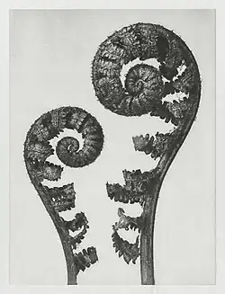 Blossfeldt's photographs gained popularity due to his unique artistic style, which set him apart from other notable photographers at the time.[14] Blossfeldt's focused and magnified photos were in stark contrast to the purposefully blurry images most photographers were producing at the time.[14] There were many characteristics of Blossfeldt's photographs that made them easily distinguishable; one being Blossfeldt's use of nature as his subject.[12] Blossfeldt spent large amounts of time in nature in his youth which was a large source of inspiration.[11] Blossfeldt held a deep appreciation for the scientific accuracy of his photographs as well as for nature so he rarely altered his natural subjects.[13] He stated that "The plant must be valued as a totally artistic and architectural structure."[9][15] Blossfeldt also maintained a detailed log of both the common and Latin names of his plant subjects.[13]