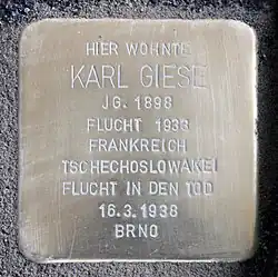 At the time of the Nazi annexation of Austria and shortly before the Nazi takeover of the Czech Sudetenland, Giese committed suicide in Brno on 16 March 1938.[9] His heir, Karel Fein, was deported to the Lodz Ghetto by the Nazi regime in October 1941, and died on 2 May 1942.[10] Giese's possessions, including his inheritance from Hirschfeld, were lost in the Holocaust.