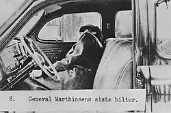 Marthinsen was assassinated by the Norwegian resistance group Milorg as part of Operation Buzzard no, acting on orders from the government in exile. A team of trained gunmen waited for his car behind a woodpile near his home in Blindernveien 74 in Oslo. The car had just started to move when they opened fire with automatic weapons, instantly killing Marthinsen in the passenger seat and lightly wounding his driver. Documents disclosed after the war indicate that the political leadership ordered the assassination to prevent Marthinsen from carrying through his plans to enlist Norwegian paramilitary forces to violently subvert the expected capitulation of Nazi Germany in Norway.