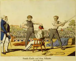 Alexandre Dumas, père wrote about Sand's life and published excerpts from his journals and letters in Karl Ludwig Sand,[2] part of Famous Crimes.[3] Prior to writing his story, Dumas visited Widmann's son in Mannheim in 1838 to gather information about Sand's character. Alexander Pushkin also memorialized Sand in his poem about assassins entitled "Kinzhal" (The Dagger).[4] In Germany three films have been made concerning the events of Karl Sand's life: Karl Sand in 1964, Sand in 1971, and Die Unbedingten in 2009.