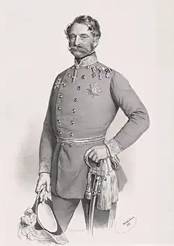 Count Thun began his military career in 1820 as a cadet in the cavalry and became a second lieutenant in 1821, a first lieutenant in 1826 and a captain-lieutenant in the infantry in 1831.[2] In 1840 he became a major and in February 1848 was made colonel[1] and commander of the 3rd Infantry Regiment.[3] With his regiment he took part in most battles of the First Italian War of Independence and then served as a major general and brigade commander in the Hungarian Revolution of 1848, participating in the battles of Komárom and Temesvár.[2] In 1850 he acted for a few months as a fortress commander in Budapest and shortly retired before returning as a brigade commander in 1852.[2] In 1854, he became a Lieutenant Field Marshal and commanded a division in Opava.[2][3][1]