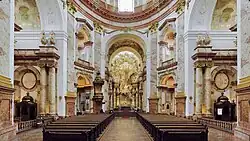 The pulpit of the church was probably designed by Fischer von Erlach the Younger, and its execution may have been carried out by the French furniture maker Claude Le Fort du Plessy in 1735, although no surviving documents confirm their authorship or the construction of the church furniture.[5] It is a wooden structure with rich floral, vegetal, rosette and rocaille ornaments, the finer carvings made of hard walnut, in a gold and brown colour scheme. The abat-voix forms a theatrical canopy, featuring two putti holding a cross and a chalice with a host, with a flaming urn at the top. Around 1860, the abat-voix was enlarged. A wide rim was added, distorting the original proportions, obscuring the elegant swirling lines, and creating a top-heavy effect. Between 2006 and 2007, this rim was removed after extensive debate, and the pulpit was restored. The missing canopy carvings were reconstructed, restoring the structure's original appearance.[6]