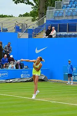 For the 2017 grass-court season, Plíšková attended the Eastbourne International as the third seed at the end of June and won the tournament after defeating Caroline Wozniacki in the final in straight sets.[23] At Wimbledon, Plíšková was again regarded as one of the pre-tournament favourites following her Eastbourne victory, but she suffered an unexpected second-round exit after losing in three-sets to world No. 87 Magdaléna Rybáriková, which made her the highest-ranked player to exit the draw at that point.[24] However, on 17 July, after Simona Halep lost in the quarterfinals at Wimbledon, Plíšková reached the world No. 1 ranking for the first time in her career.[25] She became the sixth player to reach the No. 1 position without having won a major and the first female player representing the Czech Republic to achieve the feat.[26] Czechoslovakian-born Martina Navratilova had also achieved a WTA world No. 1 ranking, but was already representing the United States when she first topped the rankings in 1978.