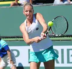 In Brisbane, Plíšková lost in the semifinals to Elina Svitolina.[27] At the Australian Open, she reached quarterfinals for the second time, having defeated Verónica Cepede Royg, Beatriz Haddad Maia, Lucie Šafářová and Barbora Strýcová.[28] In the quarterfinals, she lost to Halep in straight sets.[29] In Doha, she reached the third round, after receiving a first-round bye and defeating Alizé Cornet in second round in straight sets. In round three, she fell to American teenager Cici Bellis in straight sets, thus failing to defend her title. In Dubai, after receiving first round bye, she defeated Suárez Navarro in three sets in the second round. In the quarterfinals, she was defeated by Angelique Kerber in straight sets. In Indian Wells, Plisková reached the quarterfinals where she lost to eventual champion, Naomi Osaka. At the following tournament, the Miami Open, Plíšková was defeated by wildcard and former champion Victoria Azarenka in the quarterfinals.