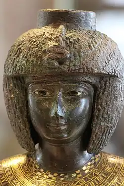 She is possibly identical with Karomama, a daughter of Pharaoh Osorkon II, who was depicted in the sed-hall of the pharaoh. She followed Henuttawy as high priestess. She is depicted in the Karnak chapel Osiris-Nebankh ("Osiris, Lord of Life"). A bronze statue of hers, Statue of Karomama, the Divine Adoratrice of Amun (N 500), which she received from her overseer of the treasury Ahentefnakht,[2] is now on display at the Louvre;[1] a votive statue of Maat she also received from him, was found in Karnak, a stela of hers, her canopic jars and ushabtis are in Berlin.[3] She was followed as God's Wife by Shepenupet I. Her tomb was found in December 2014 in the area of the Ramesseum at Thebes.[4]