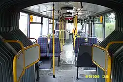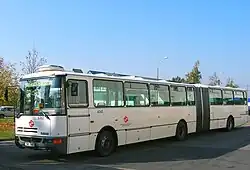Karosa B 961 is a model of the Karosa 900 series. The B 961 is derived from its predecessor the Karosa B 941, and also unified with city bus models such as the B 951 and the B 952. The body was assembled to the skeleton, which has undergone a dip stage, sheets were galvanized and painted and then to have it installed additional components. The body is made of two rigid sections linked by a pivoting joint. The body is semi-self-supporting with frame and engine with automatic gearbox is placed in the rear part. The engine drives only the third C axle, meaning that this articulated bus has a pusher configuration. The front, middle and rear axles are solid. All the axles are mounted on air suspension. On the right side are four doors (first and last are narrower than middle doors). Inside are used plastic Vogelsitze or Ster seats. The driver's cab is separated from the rest of the vehicle by a glazed partition. In the middle part and in the rear part, is room for a pram or wheelchair. Buses have an enclosed design of the turntable.