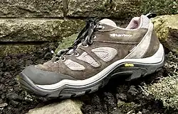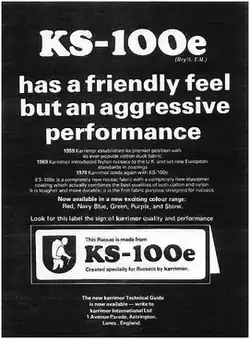 A major example of this synergistic combination of factors was Karrimor's innovation of the first robustly waterproof lightweight nylon texturised fabric, marketed as KS-100e.[17] Within 1960s textiles, cotton fibres expand when wet, bond to many coatings, and cotton fabrics are therefore easily made waterproof and rot-proof, but remain relatively heavy and cumbersome, and far from an ideal backpack textile, while nylon fabrics are lightweight, tough, flexible, easily cleaned, but technically very difficult to waterproof other than by adding coatings (with existing coatings such as polyurethane readily peeling or wearing away[6]: 64 ), and when untreated are always permeable to water (its fibres do not expand to fill the gaps when wet). Therefore, in the 1960s, robustly waterproof fabrics were still largely based on rubberised coatings, duck-cotton and the like, even though these flexed poorly and added weight. In collaboration with a local company (either BM Coatings[9] or Gordon and Fairclough,[11]: 13–14 sources differ), Karrimor developed an elastomer-nylon process in which toughened nylon fabric was waterproofed without significant weight or additional coatings, and without losing its natural flexibility, durability, texture, or other desirable qualities.[11]: 13–15 The KSB footwear range was another example, combining lightweight fabric/suede uppers, new shock absorbent materials, and fellow Briton Ken Ledward's innovative sole, to create boots that were lightweight, tough, and shock absorbent.