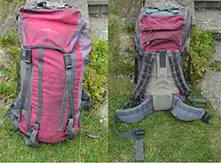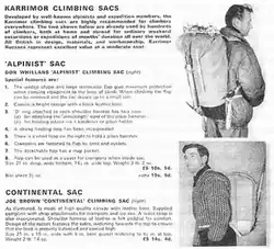 Karrimor's pre-receivership highlights included the 'Alpiniste' backpack of the 1960s and purple 'Haston Alpiniste' pack of the 1970s – described as "dominating" the decade in terms of climbing packs – leading to Chris Bonington's team in their well-publicised 1975 ascent of Everest's south-west face using Karrimor equipment (Peter Habeler likewise used the same brand three years later for his oxygen-mask-free ascent, as did Junko Tabei, Everest's first female climber [9]); Ks-100e, a pioneering waterproof nylon-based fabric invented in 1973;[3][17] a British Design Award in 1991 for the Condor backpack; the design of the ubiquitous 'SA' backpack support system;[21] and pioneering development within lightweight fabric/suede footwear (the "footwear revolution" of the 1980s) with the KSB range.[20] Backpacks at that time were often made from heavy fabrics or with a solid external frame; the Alpiniste and its relatives were the first 'modern' non-frame backpack, in the sense of being lightweight with the weight transferred to an integrated hip belt via a close-fit back support system. This was the forerunner of all non-frame modern packs of this kind.[3] During this period, Karrimor offered a lifetime warranty on its products, and was reputed for its in-house warranty and repairs service, often many years after the product purchase had taken place. These lifetime warranties are no longer honoured by the new owners of the Karrimor brand. Other highlights also included the introduction of closed cell foam mattresses (1965) known as the "Karrimat", and Karrimor's first exports and first experiments with nylon backpacks in 1967,[3] leading also to the first marketed waterproof nylon cycle bags in the 1970s (Karrimor later switched all its cycle bag production from cotton to nylon in 1980),[4] as well as the first mountain marathon (1968).[9]