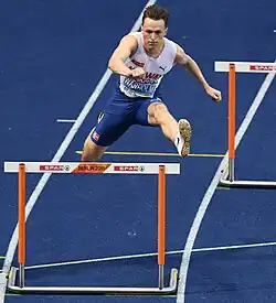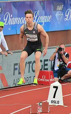 In March 2019, Warholm won gold in the 400 m at the 2019 European Athletics Indoor Championships. His time of 45.05 s equalled the European record set by Thomas Schönlebe in 1988.[17] In June at the Bislett Games in Oslo, he broke the European men's 400 m hurdles record with a time of 47.33 s.[18] At the Müller Anniversary Games in July, Warholm improved on his 400 m hurdles time, taking it to 47.12 s.[19] At the Weltklasse Zürich in August, Warholm set a new European record in the event, with a time of 46.92 s, making him the third person to run under 47 seconds for the distance. He was chased to the finish line by Rai Benjamin, who became the fourth person to break 47 seconds, with a time of 46.98 s.[20] At the 2019 World Athletics Championships in Doha, Qatar, he won the 400 m hurdles in a time of 47.42 seconds, retaining his championship title from 2017.[21]