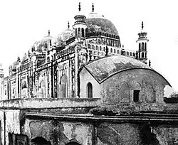The Kartalab Khan Mosque, also known as the Begum Bazar Mosque, is a mosque, located in the Begum Bazar area in the Old City of Dhaka, Bangladesh. It was built by Nawab Diwan Murshid Quli Khan (alias Kartalab Khan) between 1700 and 1704 CE.[2] The mosque consists of a high valuated platform, a mosque with a 'dochala' annex on the north upon the western half of the platform and a 'Baoli' (stepped well) to the east of the platform. It is roofed by five domes resting on octagonal drums.[3] The mosque was extensively renovated by Mirza Golam Pir in the nineteenth century.[4] In accordance with Murshid Quli Khan's wishes, he was buried under the entrance to this mosque.
