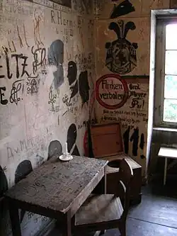 Karzers have been preserved at the universities of Heidelberg,[3] Jena, Bonn[4],Marburg, Freiburg, Tübingen, Freiberg, [5] Greifswald, Göttingen,[6] Friedrich-Alexander-Universität Erlangen-Nürnberg in Erlangen, and at Tartu, Estonia. The Karzer in Göttingen was known, after the Pedell Brühbach, as Hotel de Brühbach; it was moved in the 19th century, because of the extension of the university library, to the Aula building; a cell door, preserved from the old Karzer, shows graffiti by Otto von Bismarck. Bearing witness to how the students spent the time in the cell are the many memorable wall, table and door graffiti left by students in the cells and today shown as tourist attractions in the older German universities.[7]