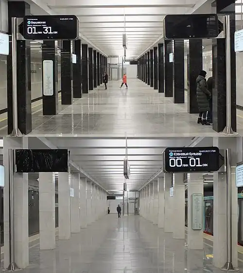 From September 12, 2020, to January 25, 2021, trains on the Zamoskvoretskaya line do not stop at the platform from the center in connection with the construction of the Big Circle Line.[4] Exits 1 and 2 are also closed. After finishing work, the platform will be closed to the center.