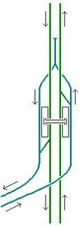One of the main reasons why the Kakhovskaya line was split off from the Zamoskovoretskaya was the track layout. In 1969 both platforms were opened with one track used on each one. In 1983 the extension to Orekhovo only continued the unused tracks without making provisions for a comfortable branch service. The result was that only the northbound platform offered cross-platform interchange, which was unnecessary as the tracks would join anyway (see diagram). The southbound tracks branched only after the station, and the passengers wishing to change the direction of the travel had to wait for the correct train on one side of the platform. (The ratio was 1:1 initially and 2:1 after the Orekhovo branch expanded to Krasnogvardeyskaya in 1985).