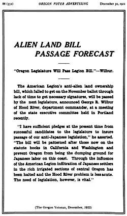 Aim was also taken at Japanese immigrants with the Alien Property Act of 1923, which prohibited Japanese-born citizens from purchasing or leasing land in the state of Oregon.[20]