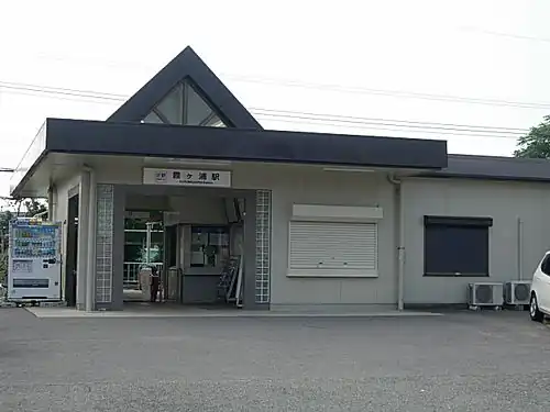 Kasumigaura Station opened on January 30, 1929 as Hazu Station (羽津駅, Hazu-eki), on the Ise Railway. The original Kasumigaura Station was a provisional station located 500 meters away in the direction of Nagoya, October 28 of the same year. and was opened on The Ise Railway became the Sangu Express Electric Railway's Ise Line on September 15, 1936 at which time the original Kasumigaura Station was elevated in status to that of a full station. The line was renamed the Nagoya Line on December 7, 1938. After merging with Osaka Electric Kido on March 15, 1941, the line became the Kansai Express Railway's Nagoya Line.[2] The original Kasumigaura Station was closed on October 23, 1943. The Kansai Express was merged with the Nankai Electric Railway on June 1, 1944 to form Kintetsu.[2] Hazu Station was renamed to its present name on June 5, 1950.