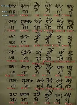 When a Khatha is inscribed on paper, cloth, metal, skin, or any other surface for that matter, it is traditionally done using the Ancient Khmer script (known as "Khom" in Thailand). The ancient Khmer script is only permitted to be used for sacred or scriptural texts, and never for common speech or everyday matters. This alphabet is considered by some Thai people to be extremely sacred and to possess spiritual power within the letters. This is the lettering seen used in Sak Yant tattoos.