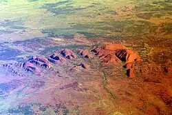 The region surrounding Kata Tjuṯa lies in the Amadeus Basin, an intracratonic basin formed during the Adelaidian, roughly 850–800 million years ago.[7] During the Petermann Orogeny, approximately 550 million years ago, an event known as the Woodroffe Thrust lifted granulite facies rocks northward over low-grade metamorphic rocks. The eventual erosion of the formation resulted in a molasse facies, or deposition in front of rising mountains, in this case, the Petermann Orogeny, creating the deposit known as the Mount Currie Conglomerate. The Mount Currie Conglomerate is made predominantly of basalt, porphyry, granite, gneiss and volcanic rock fragments with a matrix composed of angular quartz, microcline and orthoclase among other minerals.