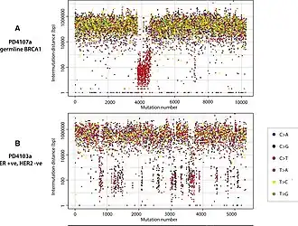 - ^ a b c d e Nik-Zainal, Serena; Alexandrov, Ludmil B.; Wedge, David C.; Van Loo, Peter; Greenman, Christopher D.; Raine, Keiran; Jones, David; Hinton, Jonathan; Marshall, John (May 2012). "Mutational Processes Molding the Genomes of 21 Breast Cancers". Cell. 149 (5): 979–993. doi:10.1016/j.cell.2012.04.024. PMC 3414841. PMID 22608084.