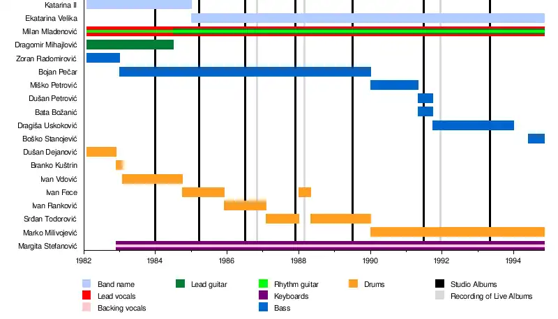 Initially called Katarina II (Serbian Cyrillic: Катарина II, lit. 'Catherine II'), the band had built up a devoted following that greatly intensified and expanded after the death of its frontman Milan Mladenović in 1994, which caused the band to dissolve. The group's core consisted of singer and guitarist Milan Mladenović, keyboardist Margita Stefanović and bassist Bojan Pečar, with other members mostly remaining for comparatively shorter periods.