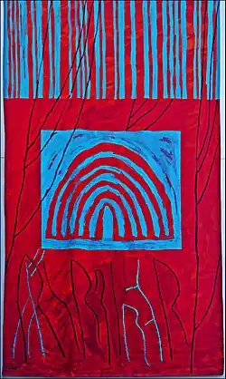 She designed Corryvrechann tapestry for the opening of the then Museum of Scotland in 1998. It measures 8 by 4 metres (26 by 13 ft) and was woven by Dovecot Studios. Since 2003 it has hung in Hawthornden Court in the now National Museum of Scotland. In 2015 the museum's conservation team took down the 90-kilogram (200 lb) tapestry and moved it to a freezer where it was kept at -30 degrees for a week to eradicate moths.[6] Corryvreckan, between the islands of Jura and Scarba, is the world's third largest whirlpool.