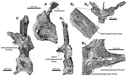 Katepensaurus is distinguished from other rebbachisaurids primarily by various details of its dorsal vertebrae. As in other sauropods, the vertebrae of Katepensaurus were highly pneumatized, with openings in the bone, such as the lateral pneumatic fossae, that would have been filled by air sacs in life. In Katepensaurus, the lateral pneumatic fossae of the dorsal vertebrae were divided in two by a ridge of bone, which is an uncommon trait among sauropods not known in other rebbachisaurids but present in the more distantly related Supersaurus.[1] Katepensaurus is unique among sauropods in exhibiting an additional set of pneumatic openings, termed laterodiapophyseal fenestrae, through which air sacs would have filled the transverse processes of the dorsal vertebrae.[3] It is these openings that give Katepensaurus its name.[1] The arrangement of the vertebral laminae, a complex arrangement of bony ridges that are characteristic of sauropod vertebrae, is generally similar between Katepensaurus and other rebbachisaurids. However, Katepensaurus shows a unique pair of laminae, termed the dorsal parapophyseal centrodiapophyseal fossa lamina and the ventral parapophyseal centrodiapophyseal fossa lamina, that have not been seen in any other rebbachisaurid.[1] Other unique traits that have been documented in the dorsal vertebrae of Katepensaurus include vertical ridges on the junction between the neural arch and centrum, well-defined, rounded fossae on the lateral aspect of the postzygapophyses,[1] and a teardrop-shaped profile of the posterior articular surface of the centrum.[2]