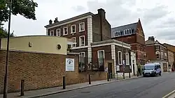 Katherine Low Settlement is Grade 2 Listed by English Heritage. The building is described as: A symmetrical house of the first third of the 18th century, 5 bays wide, of 3 storeys and of brown brick with stone dressings. It is quoined. On the ground floor the door is recessed behind a surround of Doric piers supporting frieze and cornice. On all floors the windows have shallow cambered heads. The first floor has a cillband. There is a crowning entablature. The stacks have oversailing courses. A single-storey extension with frontage to the street is similarly detailed with one blind and one glazed window and an offset entrance bay finished with a separate entablature. Listing does not include late 19th-century extension. [6]